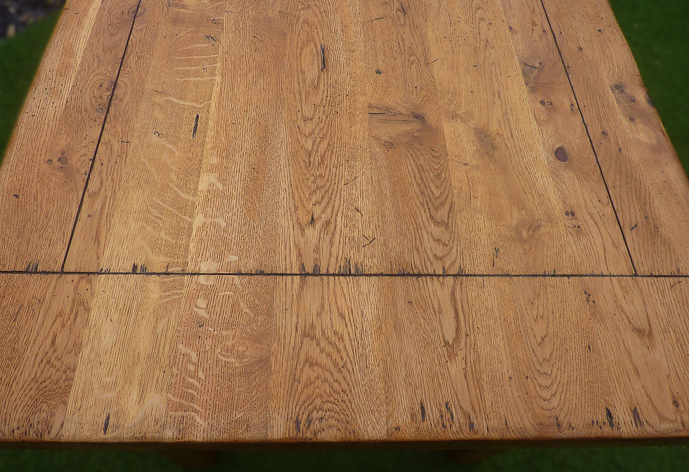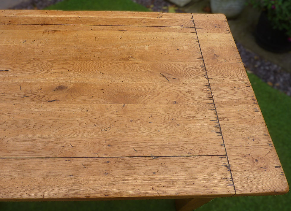 The original finish was very worn, so this was removed and the table was then refinished in several coats of a quality oil and wax finish to protect and bring out the lovely grain and features of the distressed French oak